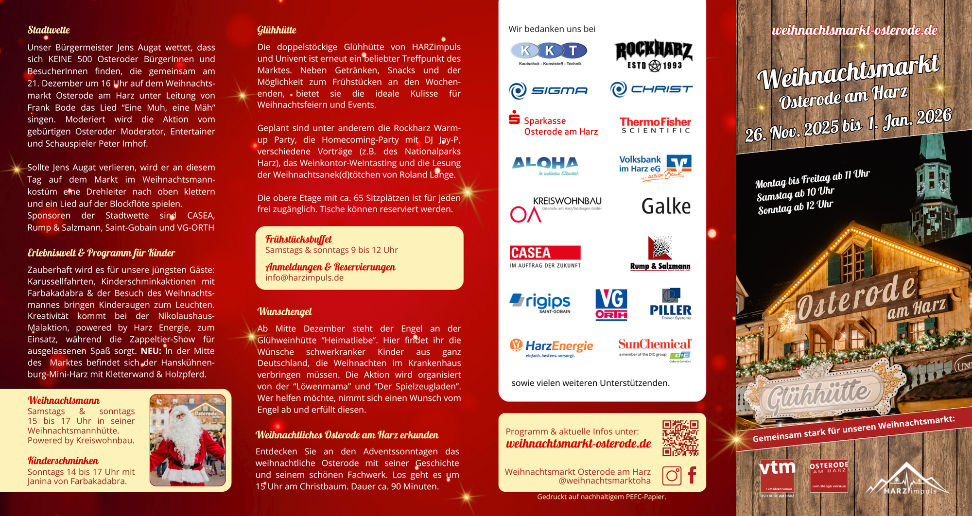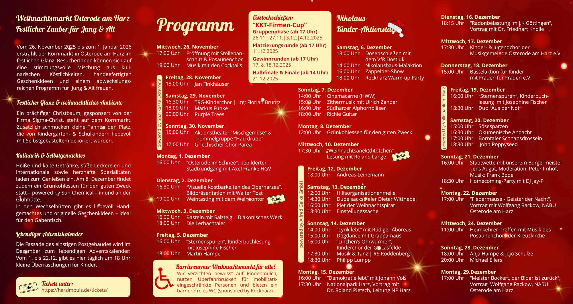 Der Weihnachtsmarkt Osterode am Harz bietet vom 26. November 2025 bis zum 1. Januar 2026 ein vielfältiges und stimmungsvolles Programm für Besucherinnen und Besucher jeden Alters. Freuen Sie sich auf musikalische Darbietungen, Aufführungen, Lesungen, Aktionen für Kinder sowie zahlreiche Veranstaltungen rund um die festliche Zeit.